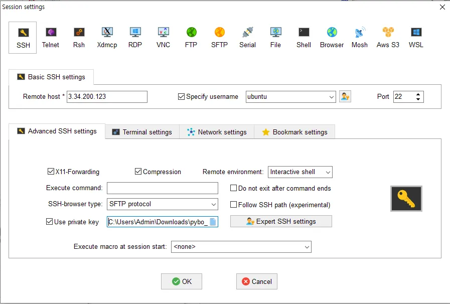 - Use private key: pybo_key.pem 선택