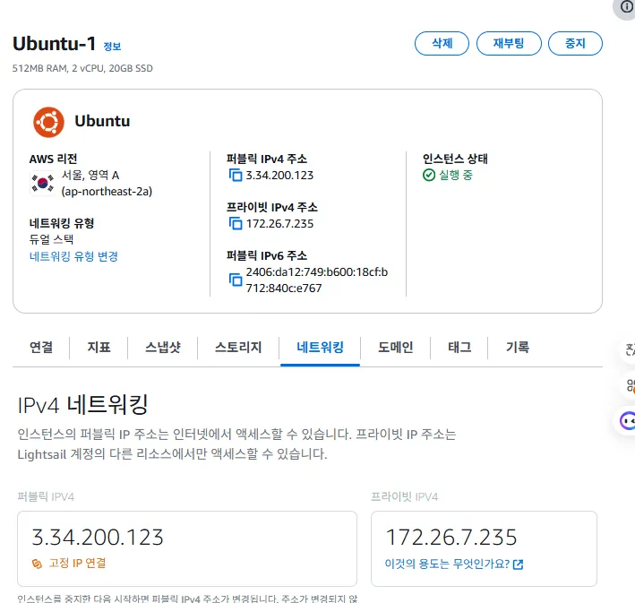- 생성한 인스턴스 클릭 → 네트워킹 탭