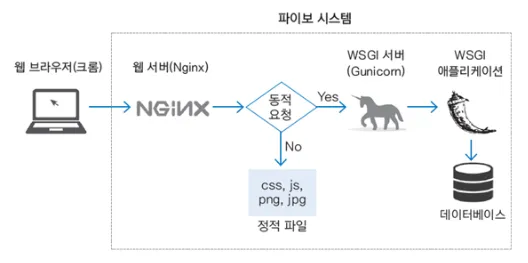 브라우저 → Nginx → Gunicorn → Flask(Pybo) → 응답 반환Gunicorn은 파이썬 프로그램을 실행하는 WSGI 서버입니다.