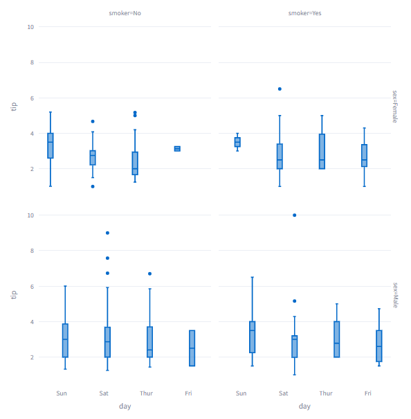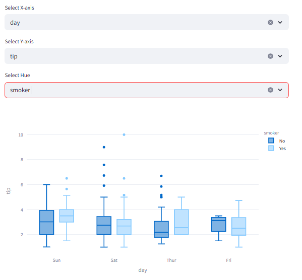 import plotly.express as px fig2= px.box( data_frame=df, x='day', y='tip', facet_col = 'smoker', facet_row='sex', width=800, height=800 ) st.plotly_chart(fig2) x_options = ['day', 'size'] y_options = ['total_bill', 'tip'] hue_options = ['smoker', 'sex'] x_option = st.selectbox( 'Select X-axis', index=None, options=x_options ) y_option = st.selectbox( 'Select Y-axis', index=None, options=y_options ) hue_option = st.selectbox( 'Select Hue', index=None, options=hue_options ) if (x_option != None) & (y_option != None): if hue_option != None: fig3 = px.box( data_frame=df, x=x_option, y=y_option, color=hue_option, width=500 ) else: fig3 = px.box( data_frame=df, x=x_option, y=y_option, width=500 ) st.plotly_chart(fig3)→ 동적으로 X축/Y축/Hue 선택해서 그래프 업데이트하는 기능도 가능!