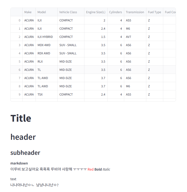 df = pd.read_csv('./datasets/CO2_emissions/CO2_Emissions.csv') st.dataframe(df) st.title('Title') st.header('header') st.subheader('subheader') st.markdown( ''' **markdown**\\ 이루비 보고싶어요 흑흑흑 루비야 사랑해 ㅜㅜㅜㅜ :red[Red] **Bold** *Italic* ''' ) st.text( ''' text 냐냐야냐냔ㅇㄴ 냥냥냐냐냔ㅇ? ''' )