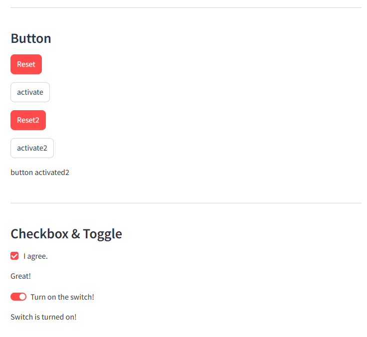 st.divider() st.subheader('Button') def button_write(): st.write('button activated') st.button('Reset', type='primary') st.button('activate', on_click=button_write) st.button('Reset2', type='primary') if st.button('activate2'): st.write('button activated2') st.divider() st.subheader('Checkbox & Toggle') active = st.checkbox('I agree.') if active: st.text('Great!') toggle = st.toggle('Turn on the switch!', value=True) if toggle: st.text('Switch is turned on!') else: st.text('Switch is turned off!')