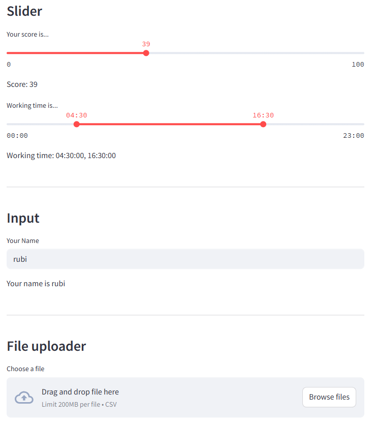st.divider() st.subheader('Slider') score = st.slider('Your score is...', 0, 100, 1) st.text('Score: {}'.format(score)) from datetime import time start_time, end_time = st.slider( 'Working time is...', min_value=time(0), max_value=time(23), value=(time(8), time(18)), format='HH:mm' ) st.text('Working time: {}, {}'.format(start_time, end_time)) st.divider() st.subheader('Input') string = st.text_input( 'Your Name', placeholder='write down your name', max_chars=31 ) if string: st.text('Your name is '+string) st.divider() st.subheader('File uploader') file = st.file_uploader('Choose a file', type='csv', accept_multiple_files=False) if file is not None: df = pd.read_csv(file) st.write(df)- 슬라이더로 점수나 시간 등 입력 받기