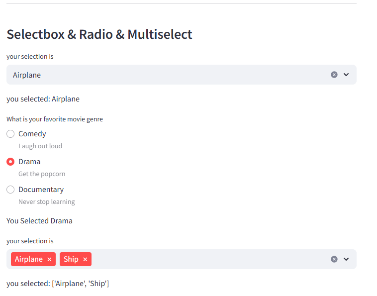 st.divider() st.subheader('Selectbox & Radio & Multiselect') option1 = st.selectbox( label='your selection is', options=['Car', 'Airplane', 'Train', 'Ship'], index=None, placeholder='select transportation' ) st.text('you selected: {}'.format(option1)) option2 = st.radio( 'What is your favorite movie genre', ['Comedy', 'Drama', 'Documentary'], captions=['Laugh out loud', 'Get the popcorn', 'Never stop learning'] ) if option2: st.text('You Selected {}'.format((option2))) option3 = st.multiselect( label='your selection is', options=['Car', 'Airplane', 'Train', 'Ship'], placeholder='select transportation' ) st.text('you selected: {}'.format(option3))- 셀렉트박스나 라디오 버튼으로 사용자 선택 받기