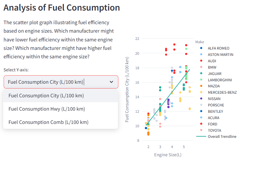 동일한 엔진 크기에서도 제조사마다 연비에 차이가 있음을 확인할 수 있습니다.st.subheader('Analysis of Fuel Consumption') col3, col4 = st.columns(2) with col3: st.write( ''' The scatter plot graph illustrating fuel efficiency based on engine sizes. Which manufacturer might have lower fuel efficiency within the same engine size? Which manufacturer might have higher fuel efficiency within the same engine size? ''' ) st.selectbox( 'Select Y-axis: ', [ 'Fuel Consumption City (L/100 km)', 'Fuel Consumption Hwy (L/100 km)', 'Fuel Consumption Comb (L/100 km)' ], key='fig2_yaxis' ) with col4: fig2 = px.scatter( data_frame=df, x='Engine Size(L)', y=st.session_state['fig2_yaxis'], width=500, color='Make', trendline='ols', trendline_scope='overall' ) st.plotly_chart(fig2) st.divider()