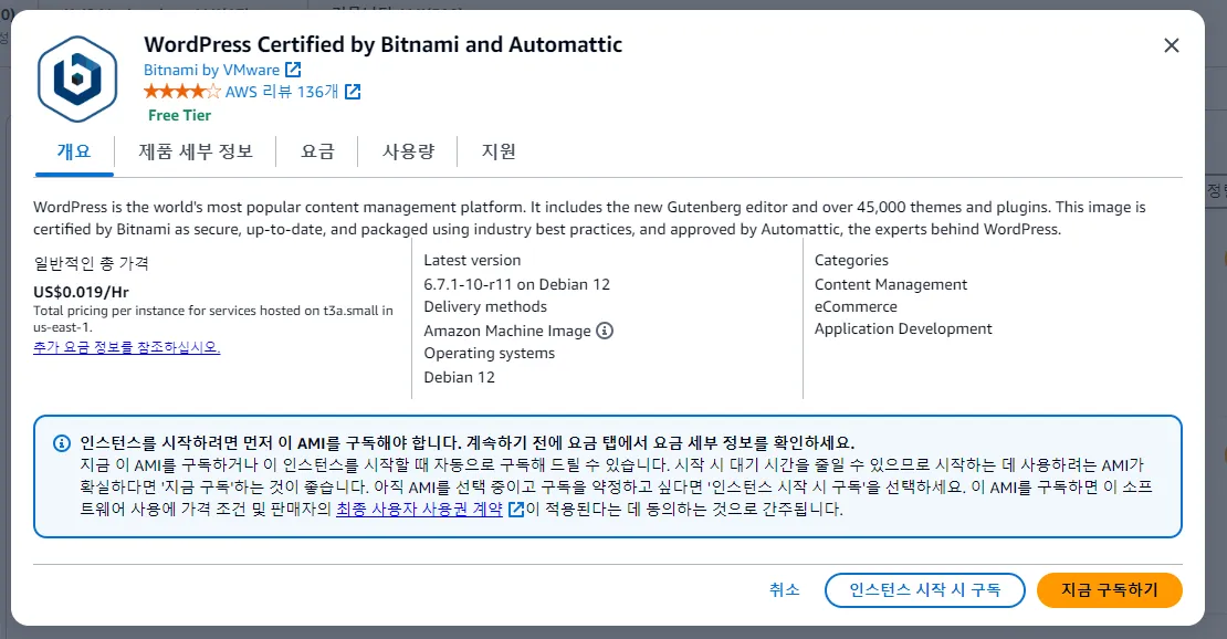- ec2 > 인스턴스 시작 > 이름 설정 > wordpress bitnami 검색 > 지금 구독하기 > 인스턴스 유형 프리티어 가능한 것으로 변경 > 키 페어 설정 > 인스턴스 시작