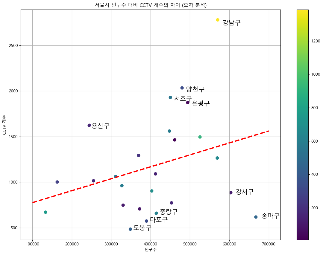 # 오차 계산 (예상 CCTV 개수 - 실제 CCTV 개수) data_result['오차'] = np.abs(data_result['소계'] - f1(data_result['인구수'])) # 오차가 큰 순으로 정렬 df_sort = data_result.sort_values(by='오차', ascending=False) # 시각화 plt.figure(figsize=(14, 10)) plt.scatter(df_sort['인구수'], df_sort['소계'], c=data_result['오차'], s=50) plt.plot(fx, f1(fx), ls='dashed', lw=3, color='r') # 추세선 추가 # 오차가 큰 10개 구의 이름을 그래프에 표시 for n in range(10): plt.text(df_sort['인구수'][n] * 1.02, # x 좌표 df_sort['소계'][n] * 0.98, # y 좌표 df_sort.index[n], # 구 이름 fontsize=15) plt.xlabel('인구수') plt.ylabel('CCTV 개수') plt.colorbar() # 오차 크기 표현 plt.grid() plt.title('서울시 인구수 대비 CCTV 개수의 차이 (오차 분석)') plt.show()결과 분석: