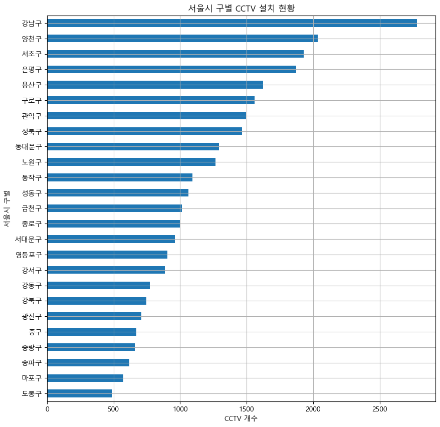 plt.rcParams['axes.unicode_minus'] = False # 마이너스 폰트 깨짐 방지 if platform.system() == 'Darwin': # Mac rc('font', family='AppleGothic') elif platform.system() == 'Windows': # Windows path = 'c:/Windows/Fonts/malgun.ttf' font_name = font_manager.FontProperties(fname=path).get_name() rc('font', family=font_name) else: print("sorry")2) 구별 CCTV 설치 현황 시각화