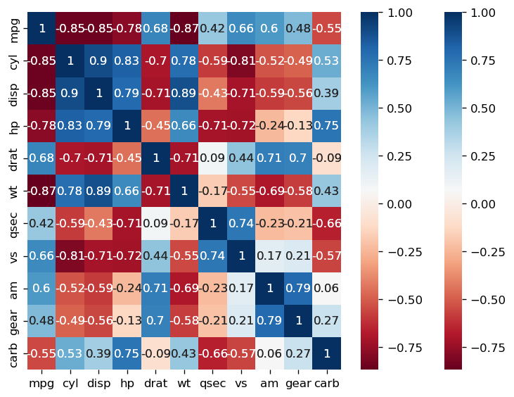 mtcars = pd.read_csv('./data/mtcars.csv') ''' mpg cyl disp hp drat wt qsec vs am gear carb 0 21.0 6 160.0 110 3.90 2.620 16.46 0 1 4 4 1 21.0 6 160.0 110 3.90 2.875 17.02 0 1 4 4 2 22.8 4 108.0 93 3.85 2.320 18.61 1 1 4 1 ''' # 상관행렬 만들기 car_cor = mtcars.corr() # 소수점 둘째 자리까지 반올림 car_cor = round(car_cor, 2) # 해상도 설정 plt.rcParams.update({'figure.dpi': '120', 'figure.figsize': [7.5, 5.5]}) # 히트맵: sns.heatmap(상관행렬, 상관계수 표시, 컬러맵) # 상관계수 표시: annot: True # 컬러맵: cmap='RdBu' sns.heatmap(car_cor, annot=True, cmap='RdBu') plt.show()📊 결과 해석