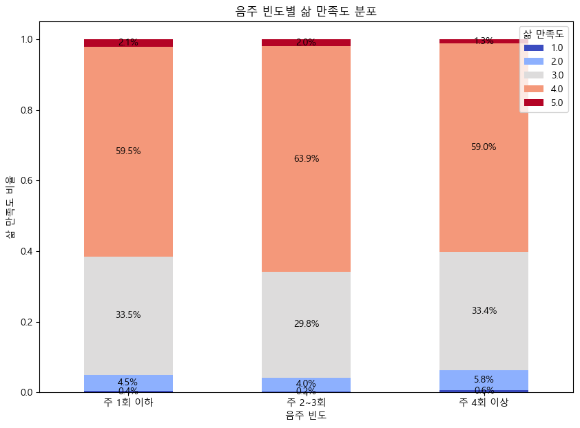 # 음주 빈도 변수 변환 welfare['avg_drink'] = np.where(welfare['avg_drink'] == 3, '주 2~3회', np.where(welfare['avg_drink'] == 4, '주 4회 이상', '주 1회 이하')) avg_life_sat_by_drink = welfare.dropna(subset=['life_sat', 'avg_drink']) \ .groupby(['avg_drink', 'life_sat'], as_index = False).agg(life_sat_count = ('life_sat', 'count')) # 데이터 피벗 df_pivot = avg_life_sat_by_drink.pivot(index='avg_drink', columns='life_sat', values='life_sat_count') df_pivot = df_pivot.div(df_pivot.sum(axis=1), axis=0) # 각 행(음주 빈도)별 비율 변환 # 그래프 그리기 plt.rcParams.update({'font.family' : 'Malgun Gothic'}) fig, ax = plt.subplots(figsize=(10,7)) df_pivot.plot(kind='bar', stacked=True, colormap='coolwarm', ax=ax) plt.xticks(rotation=0) plt.xlabel('음주 빈도') plt.ylabel('삶 만족도 비율') plt.title('음주 빈도별 삶 만족도 분포') plt.legend(title="삶 만족도", loc='upper right') plt.show()분석 결론