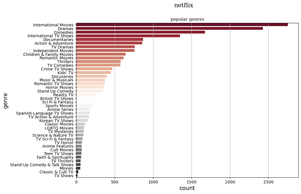 genres = netflix['listed_in'].str.split(', ', expand=True).stack().value_counts() plt.figure(figsize=(10,7)) sns.barplot(x=genres.values, y=genres.index, hue=genres.index, palette='RdGy') plt.suptitle('Netflix', fontfamily='serif', fontsize=15) plt.title('Popular Genres', fontfamily='serif', fontsize=11) plt.xlabel('Count', fontsize=14) plt.ylabel('Genre', fontsize=14) plt.grid(axis='x') plt.show()4. 🌍 국가별 시청층 분석 (히트맵 활용)