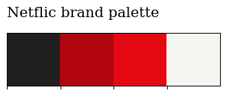 sns.palplot(['#221f1f','#b20710','#e50914','#f5f5f1']) plt.title('Netflix Brand Palette', loc='left', fontfamily='serif', fontsize=15, y=1.2) plt.show()2. 🍿 영화 vs TV 쇼 비율 (파이 차트)