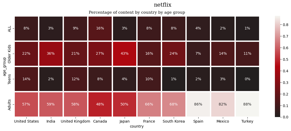 plt.figure(figsize =(15,5)) cmap = plt.matplotlib.colors.LinearSegmentedColormap.from_list('', ['#221f1f','#b20710','#f5f5f1']) sns.heatmap(netflix_age_country_unstack, cmap = cmap, linewidths=2.5, annot=True, # 각 셀에 데이터 값 표시 fmt = '.0%' ) plt.suptitle('netflix', fontfamily='serif', fontsize=15) plt.title('Percentage of content by country by age group', fontfamily='serif', fontsize=11) plt.show()