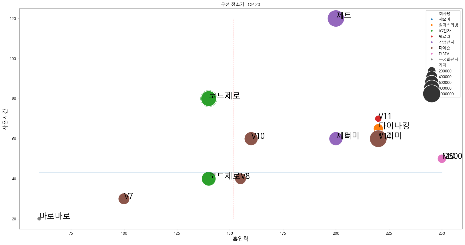 chart_data_selected = chart_data[:20] plt.figure(figsize=(20,10)) plt.title('무선 청소기 TOP 20', fontsize=11) sns.scatterplot(x='흡입력', y = '사용시간', size = '가격', hue = chart_data_selected['회사명'], data = chart_data_selected, sizes = (100, 2000), ) # 사용 시간 평균을 선으로 plt.plot([60, suction_max_value], [use_time_mean_value, use_time_mean_value], lw = 1) # 흡입력 평균을 선으로 plt.plot([sucton_mean_value, sucton_mean_value], [20, use_time_max_value], 'r--', lw = 1) for index, row in chart_data_selected.iterrows(): x = row['흡입력'] y = row['사용시간'] s = row['제품']. split()[0] plt.text(x, y, s, size=20) plt.xlabel('흡입력',fontsize=14) plt.ylabel('사용시간', fontsize=14) plt.legend() plt.show()