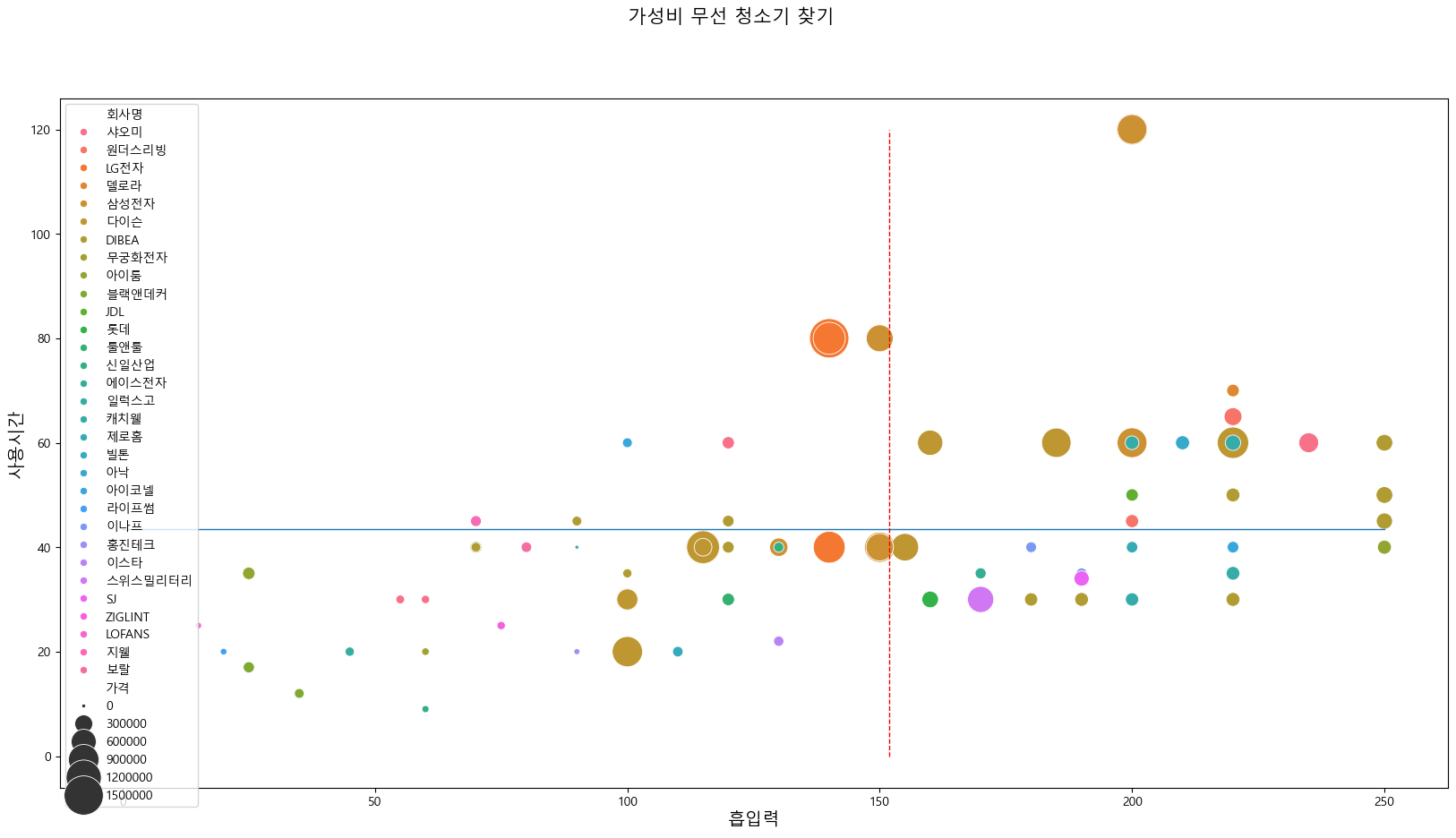 chart_data = danawa_data.dropna() suction_max_value = danawa_data['흡입력'].max() use_time_max_value = danawa_data['사용시간'].max() plt.figure(figsize=(20,10)) plt.suptitle('무선 청소기', fontsize=15) plt.title('성능', fontsize=11) sns.scatterplot(x='흡입력', y='사용시간', size='가격', hue=chart_data['회사명'], data=chart_data, sizes=(10, 1000)) plt.plot([0, suction_max_value], [use_time_mean_value, use_time_mean_value], lw=1) plt.plot([suction_mean_value, suction_mean_value], [0, use_time_max_value], 'r--', lw=1) plt.xlabel('흡입력', fontsize=14) plt.ylabel('사용시간', fontsize=14) plt.legend() plt.show()
